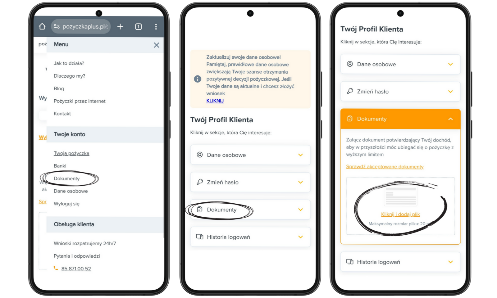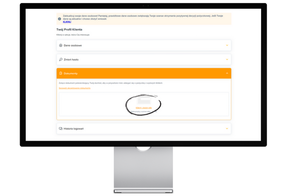 UWAGA! Dokumenty potwierdzające wysokość Twoich dochodów możesz załączyć jeszcze przed złożeniem wniosku o pożyczkę w wyższej kwocie, dzięki czemu w przyszłości proces aplikacji przebiegnie sprawniej. Możesz to zrobić logując się do swojego profilu w strefie klienta i wchodząc w zakładkę “Dane osobowe”. Dodanie dokumentu jest bardzo proste zarówno na telefonie, jak i na komputerze.